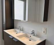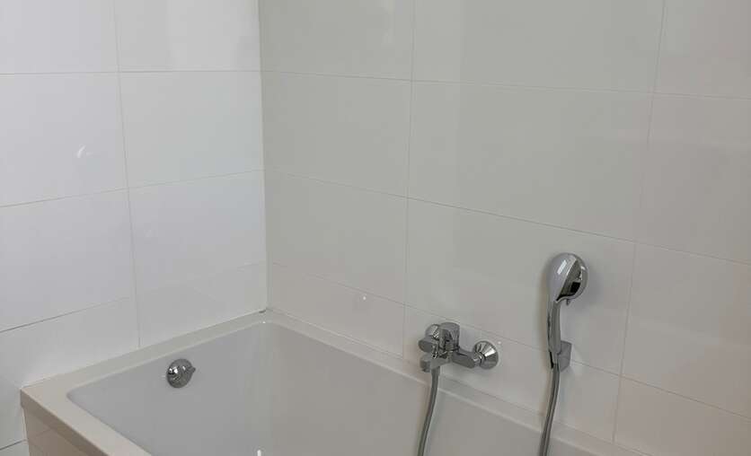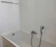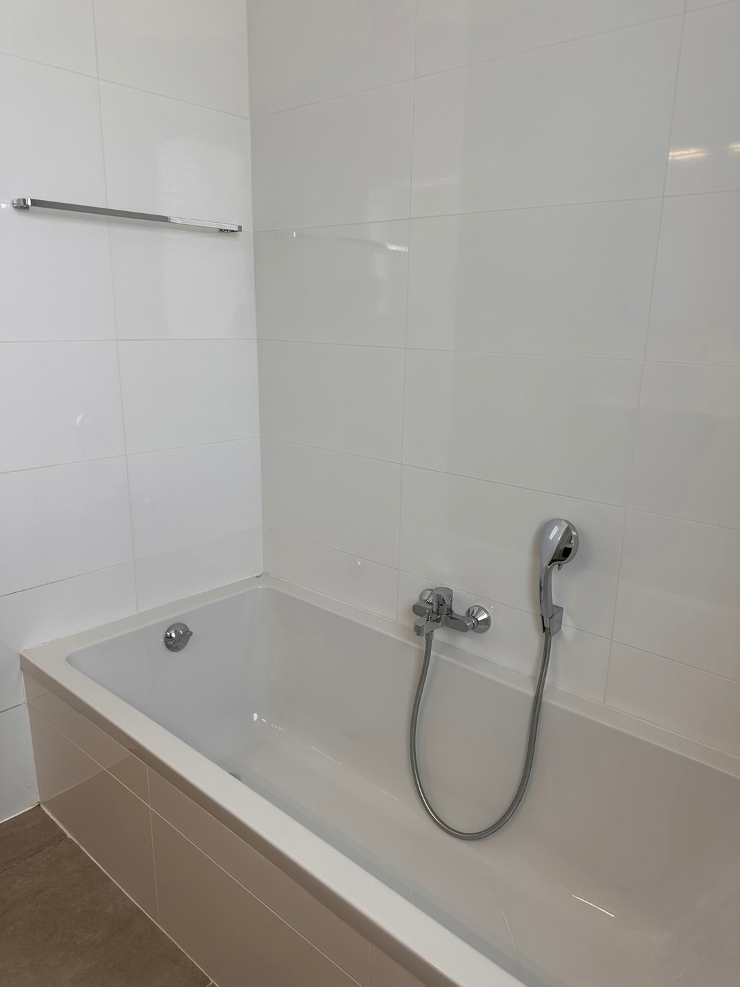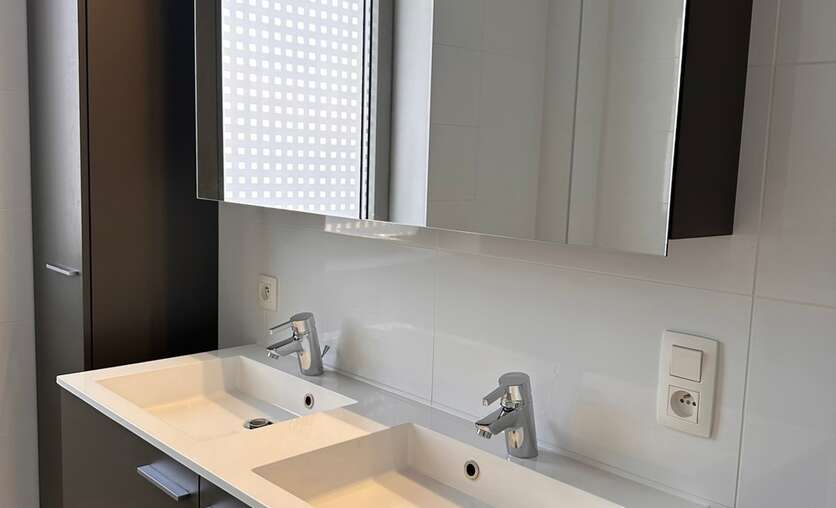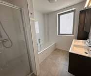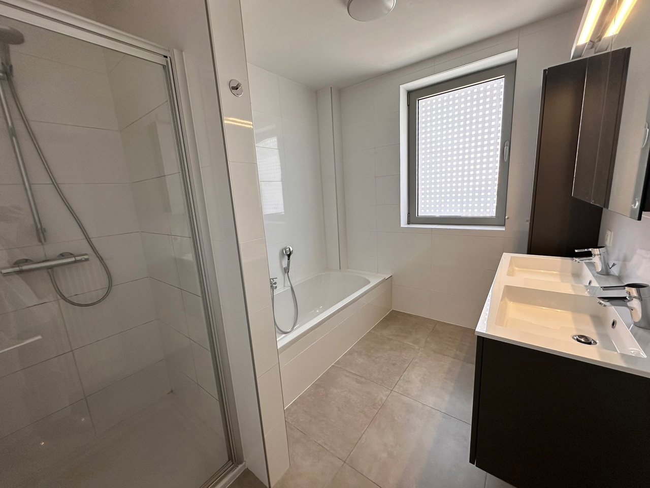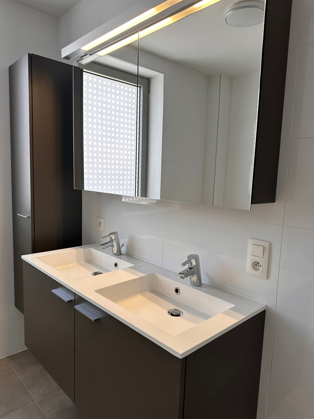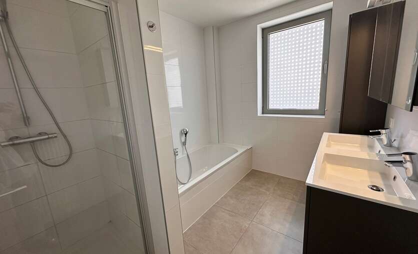 - Badkamer met instapdouche, ligbad en dubbel lavabomeubel