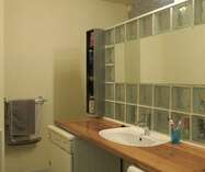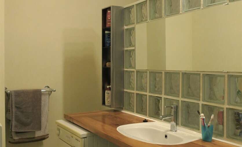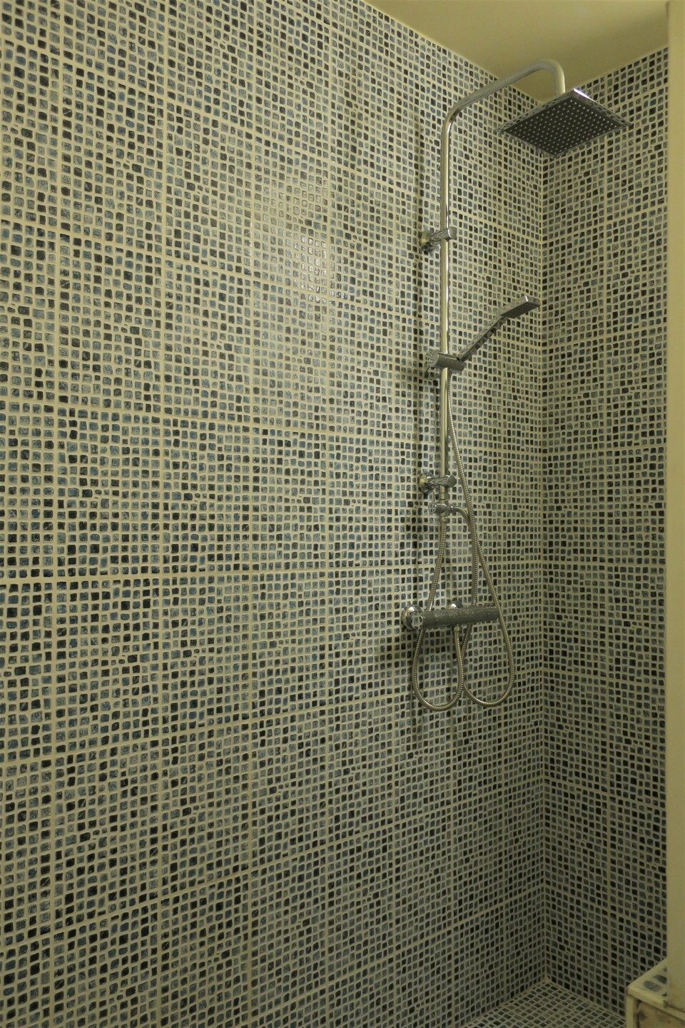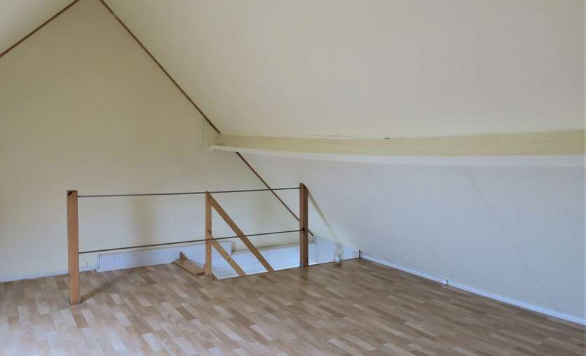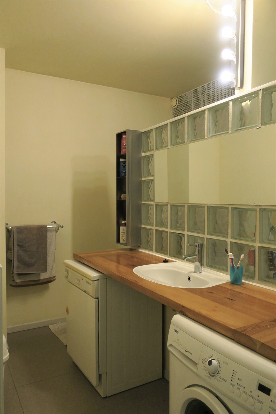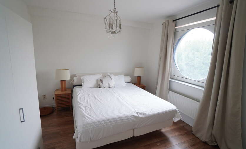 Op de eerste verdieping bevindt zich een slaapkamer, een badkamer met toilet, grote inloopdouche en lavabomeubel. Hier vind je ook de aansluiting voor een wasmachine.