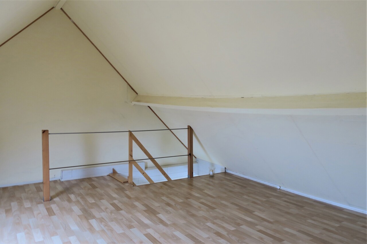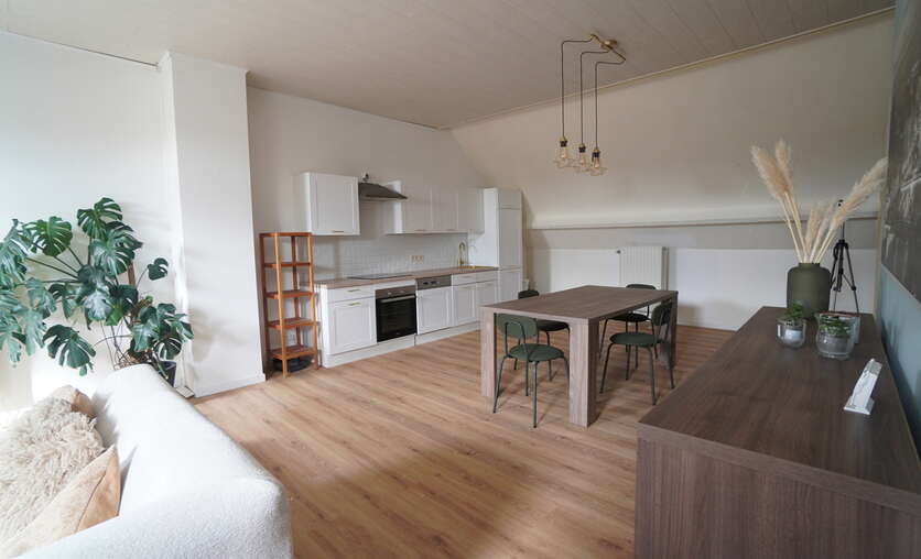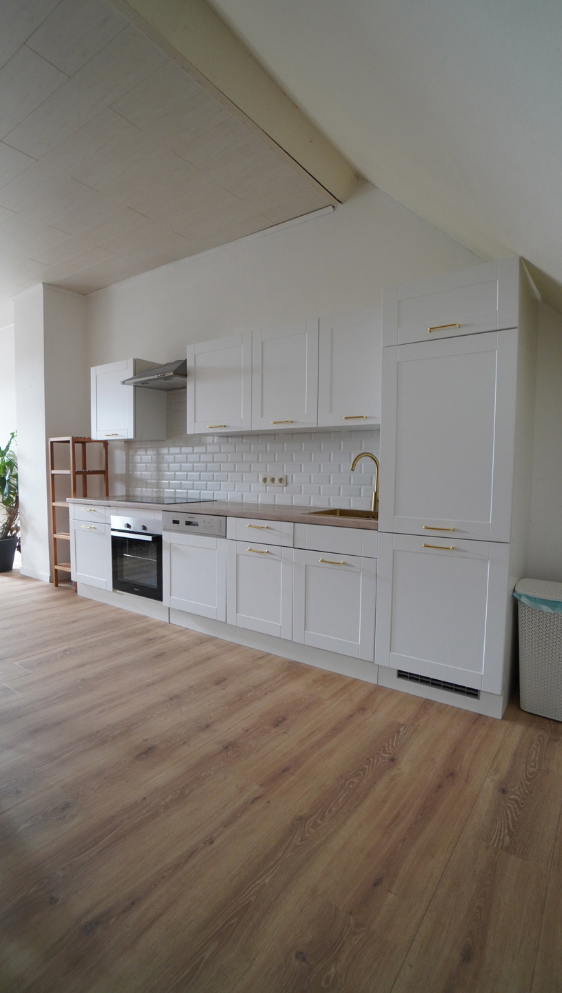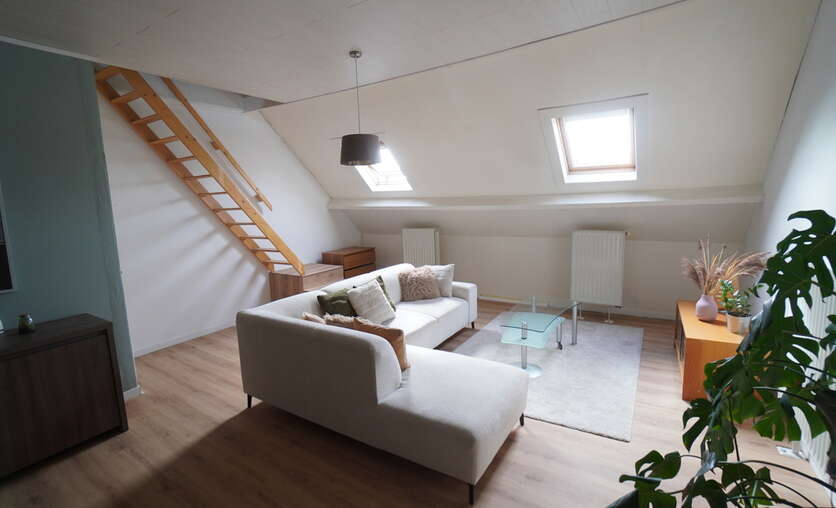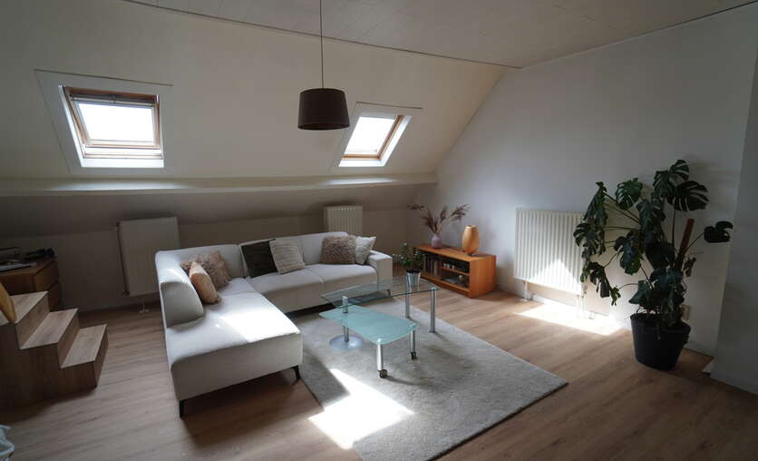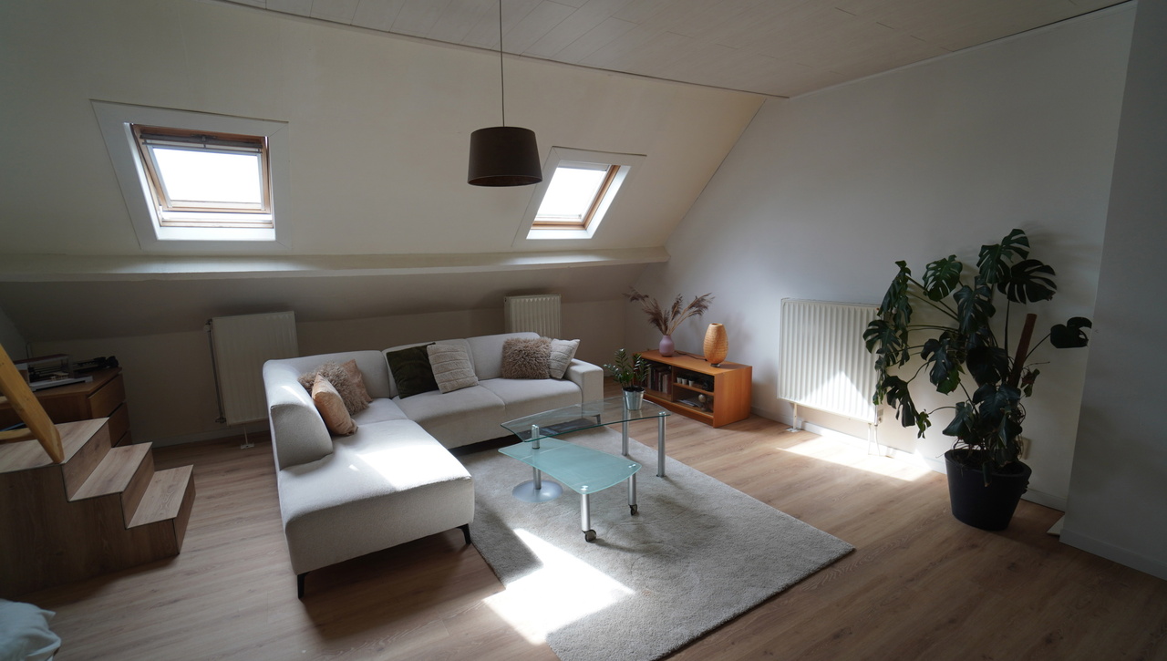 De tweede verdieping omvat een ruime woonkamer met een open, uitgeruste keuken. Vanuit de woonkamer leidt een trap naar de zolderverdieping van 12m², die ideaal kan dienen als bergruimte of bureauruimte.