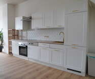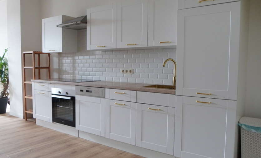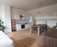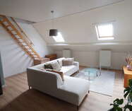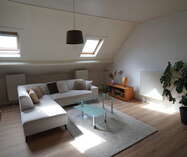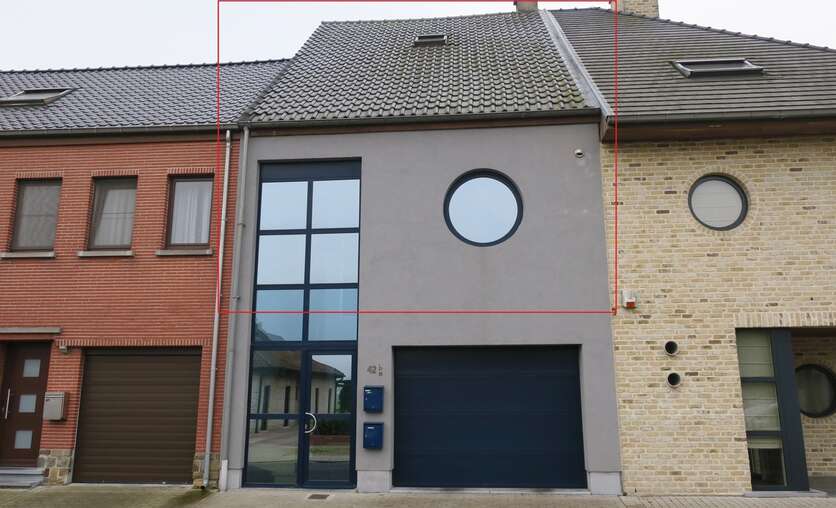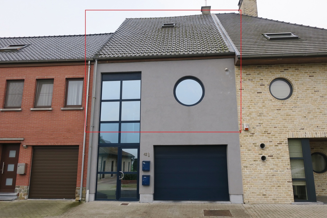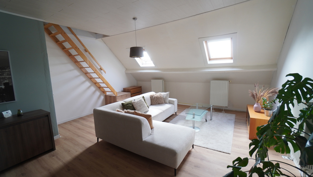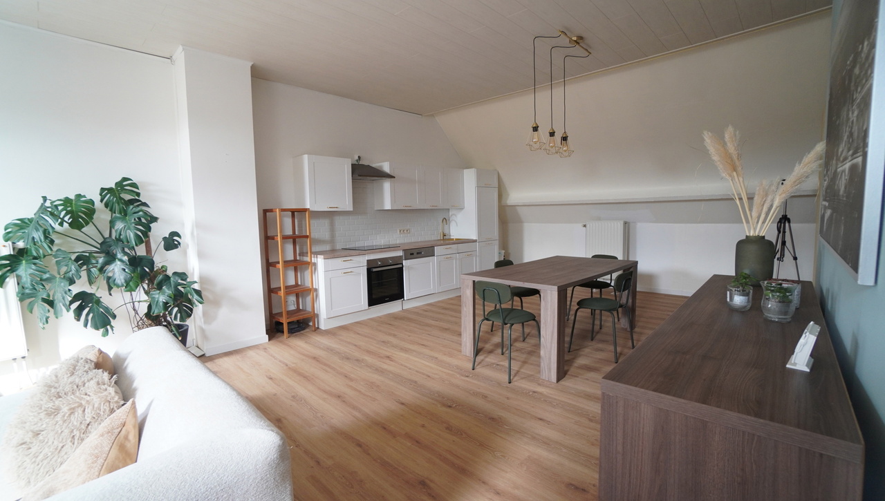 De tweede verdieping omvat een ruime woonkamer met een open, uitgeruste keuken. Vanuit de woonkamer leidt een trap naar de zolderverdieping van 12m², die ideaal kan dienen als bergruimte of bureauruimte.