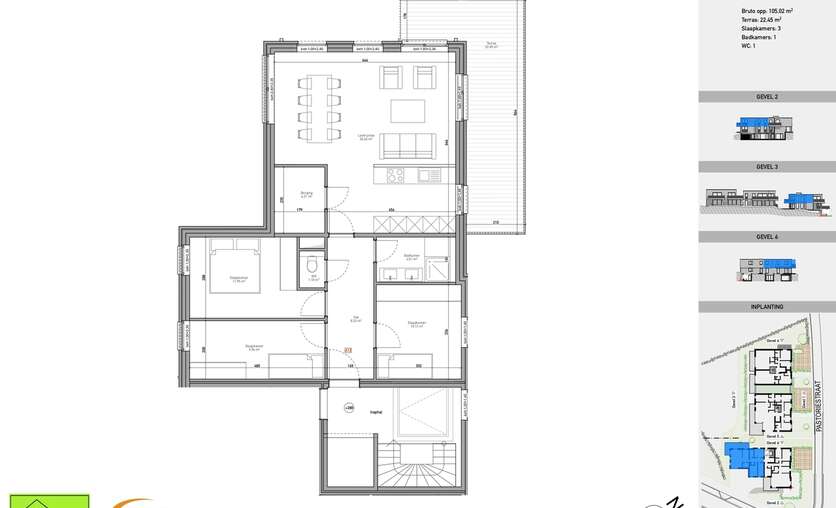 Het appartement A12 bevindt zich op de eerste verdieping in het A-gebouw langsheen de Pastoriestraat. Dit appartement beschikt over een inkomhal met vestiaire en toilet, een ruime leefruimte met open keuken en aangrenzende berging. De leefruimte geeft uit op een ruim terras met zicht op de gemeenschappelijke tuin. Het nachtgedeelte heeft een badkamer en 3 slaapkamers.