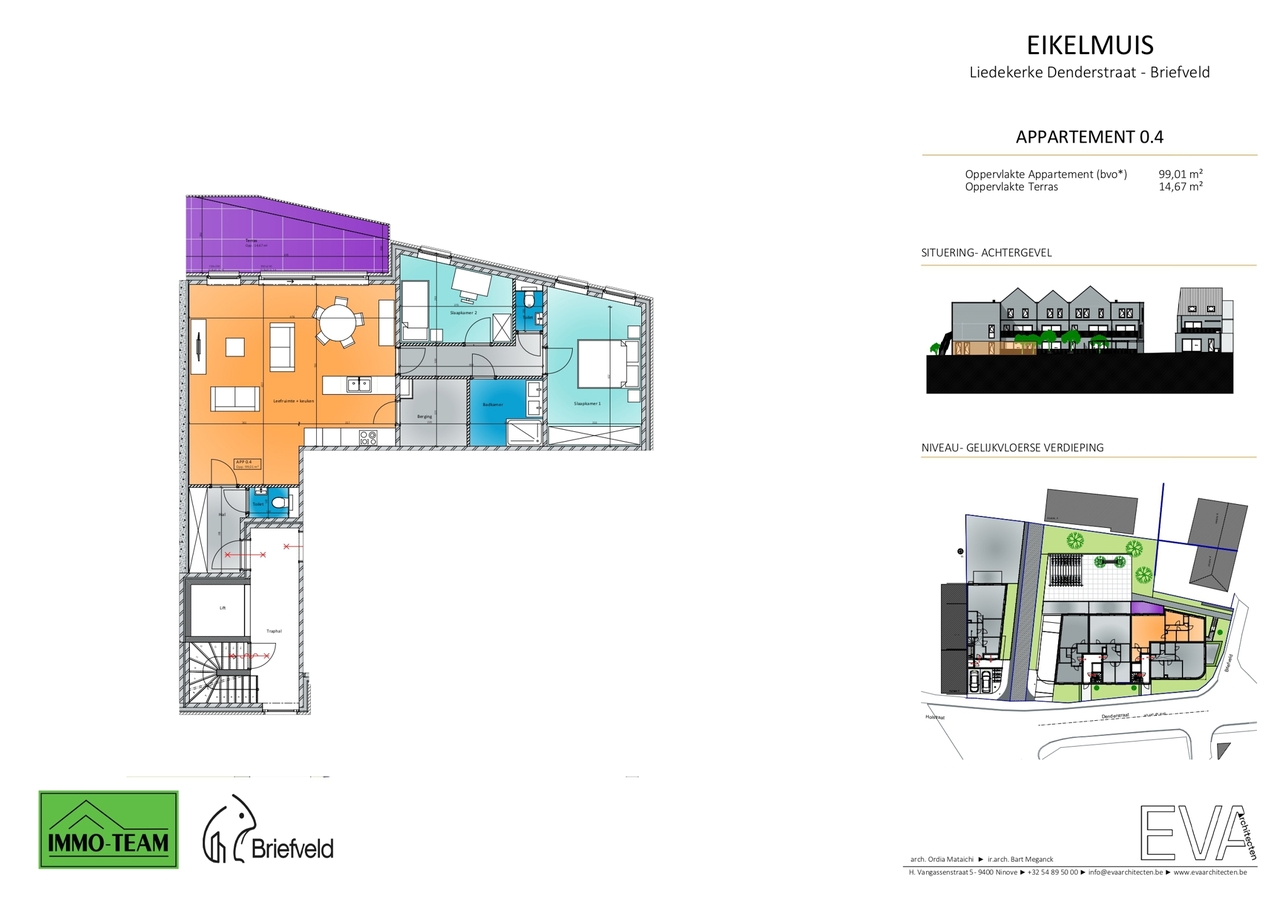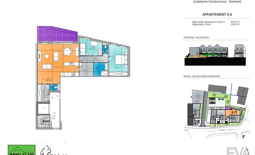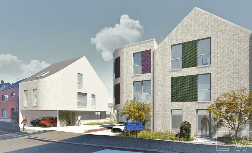 Appartement 0.4 bevindt zich uiterst rechts op het gelijkvloers van het 4-gevel gebouw. Dit appartement beschikt over een inkomhal met toilet, 2 slaapkamers, badkamer met aansluitend 2de toilet, een ruime leefruimte met open keuken en aangrenzende berging. De leefruimte geeft uit op een ruim terras.