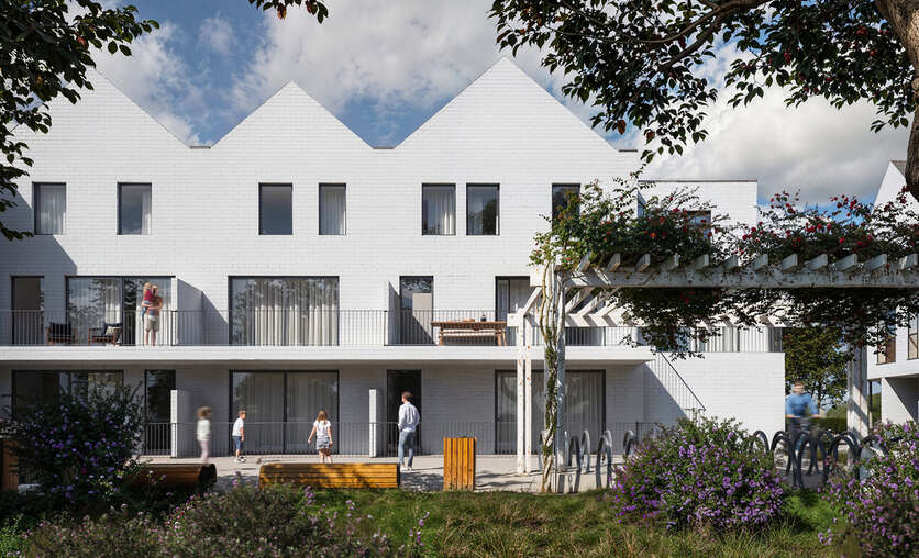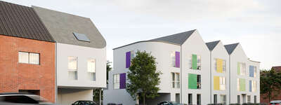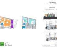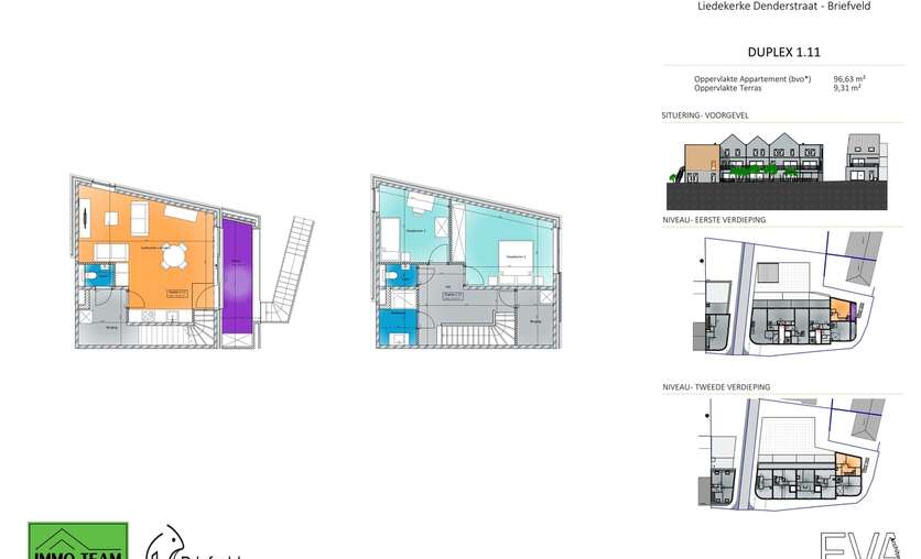 Appartement 1.11 bevindt zich op de 1ste verdieping van het 4-gevel gebouw. Deze duplex beschikt over een inkomhal met toilet, een ruime leefruimte met open keuken en aangrenzende berging. De leefruimte geeft uit op een ruim terras. Op de 2de verdieping is er een nachthal met badkamer, apart toilet en 2 slaapkamers.