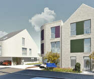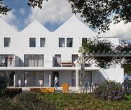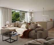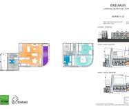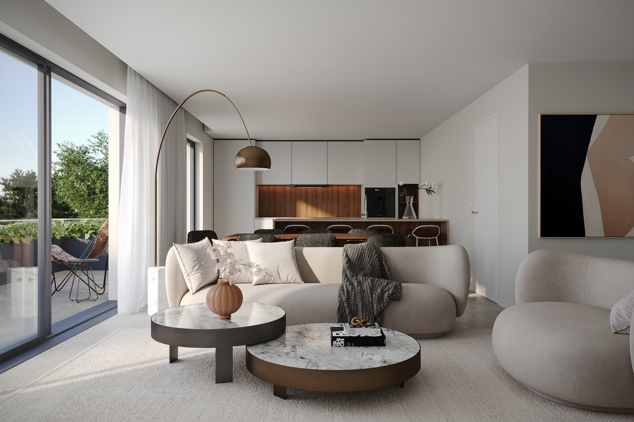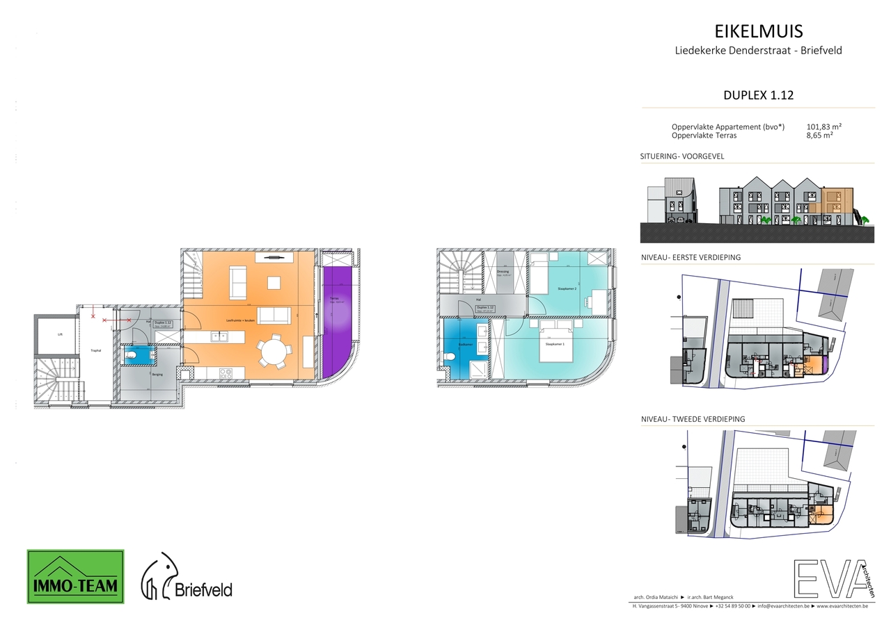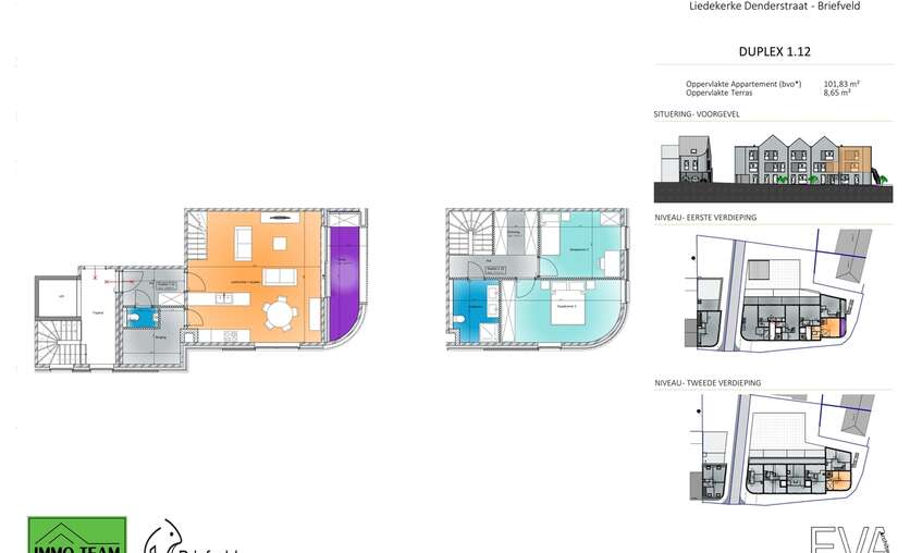 Appartement 1.12 bevindt zich op de 1ste en 2de verdieping van het 4-gevel gebouw. Deze duplex beschikt over een inkomhal met toilet, een ruime leefruimte met open keuken en aangrenzende berging. De leefruimte geeft uit op een ruim terras. Op de 2de verdieping is er een nachthal met badkamer en toilet en 2 slaapkamers.